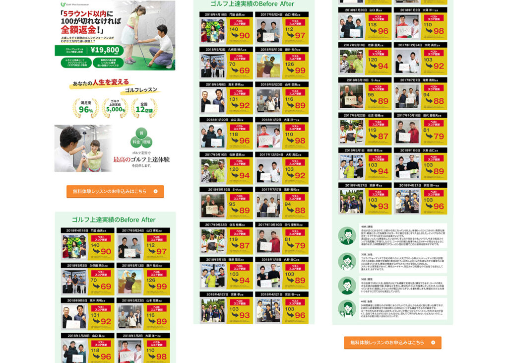 50代~60代の方向けなので、大きめの文字サイズ、はっきりとしたコントラストの配色を意識しました。また、体験レッスンのイメージは湧くような写真を使用しています。